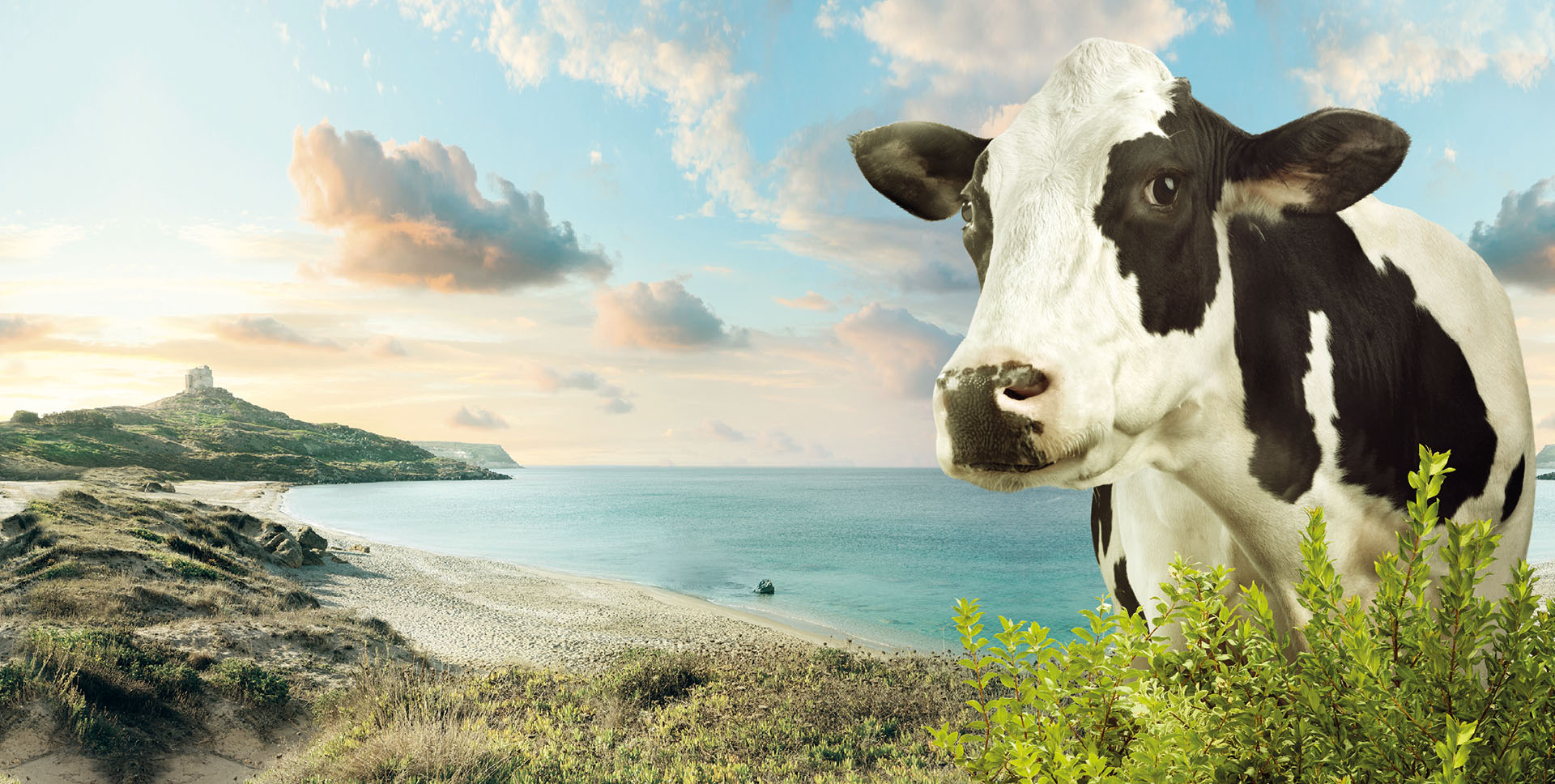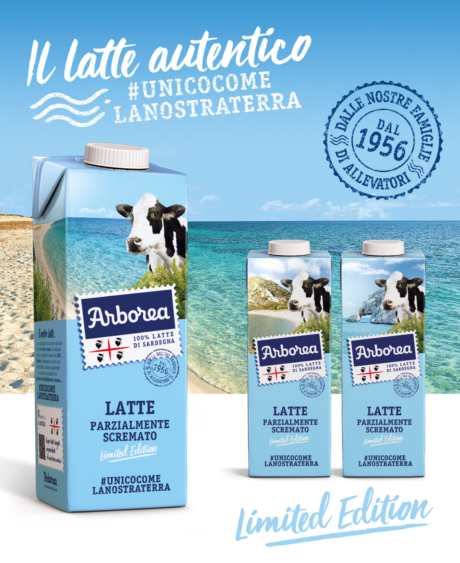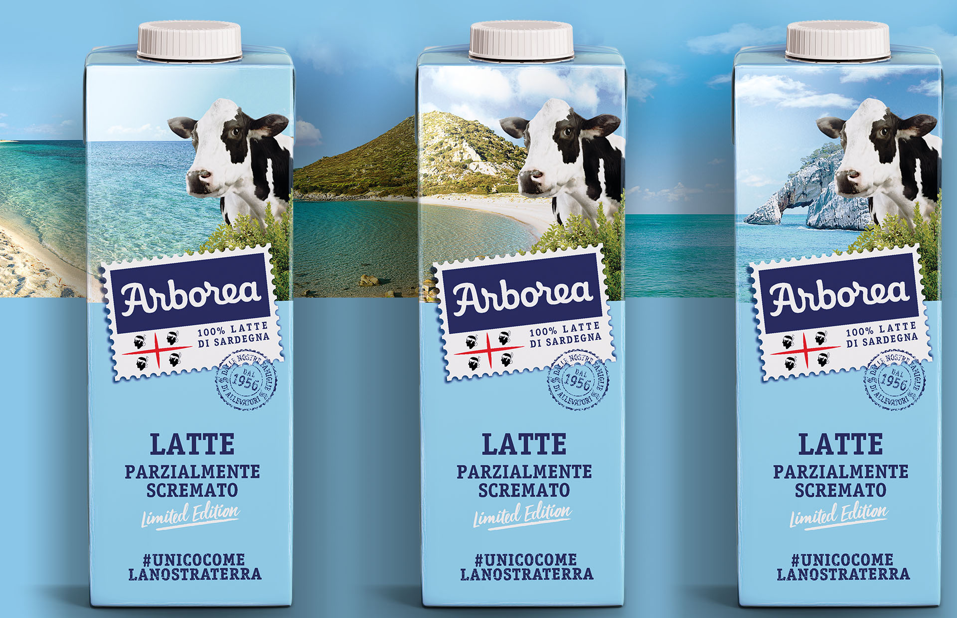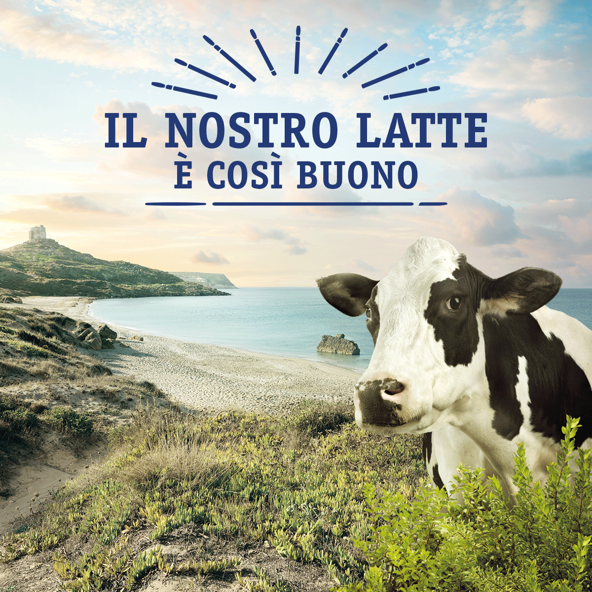 Una mucca al mare, con sullo sfondo località tra le più suggestive dell’isola, rinnova la confezione azzurra del latte come fosse una cartolina dalla Sardegna.