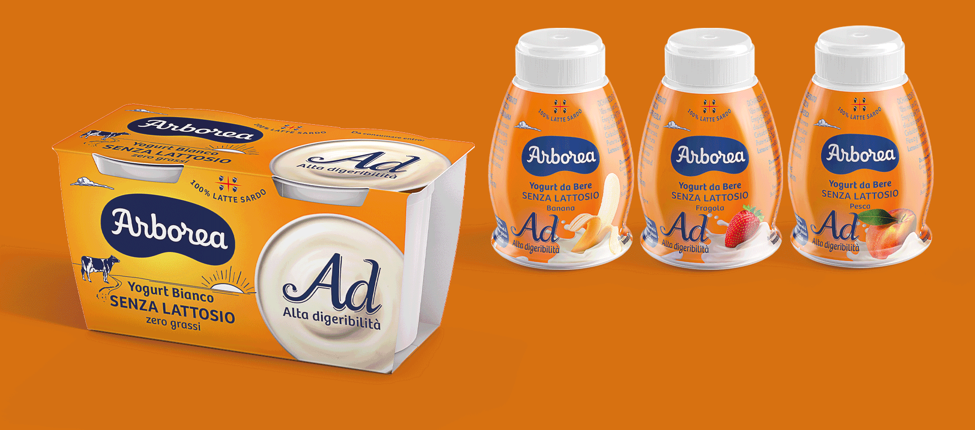 Abbiamo scelto cromie differenzianti per le tre linee, mantenendo il brand Ad, che corrisponde alla linea senza lattosio. Per enfatizzare maggiormente la regionalità della produzione abbiamo disegnato un device grafico che riporta la bandiera sarda e rimane trasversale ad ogni confezione.