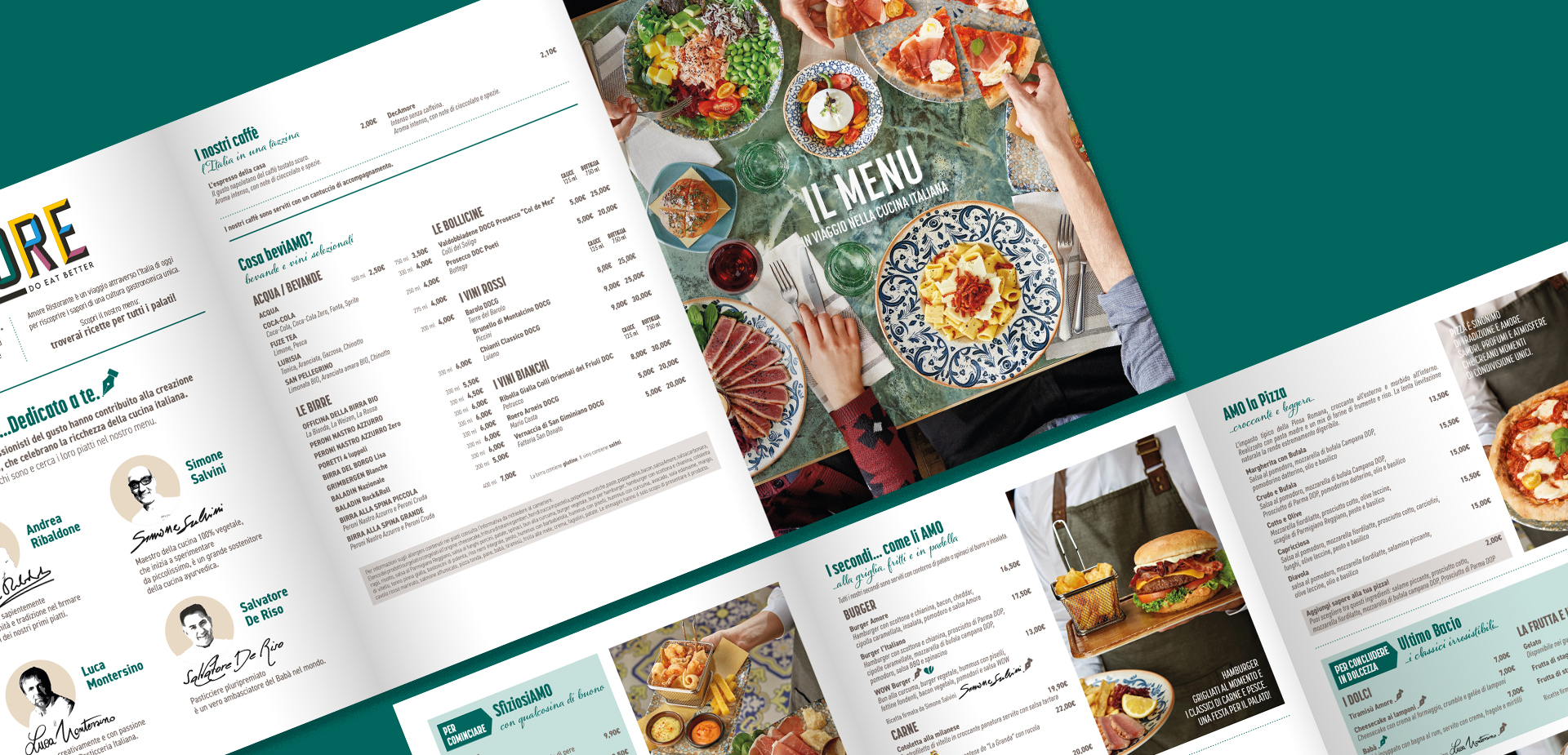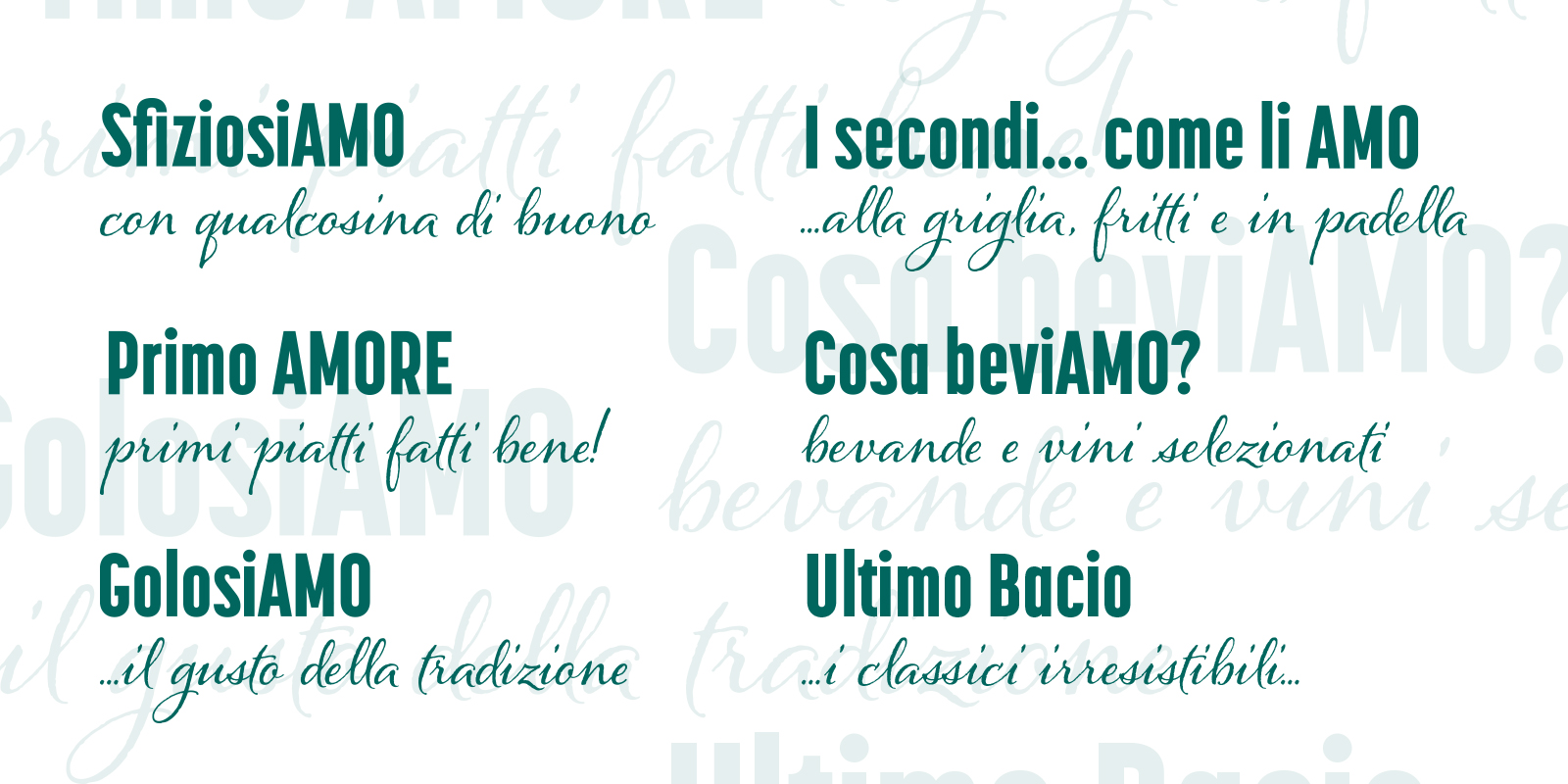 Nel menù, la copertina presenta uno scatto zenitale che esprime condivisione e suggerisce un’offerta alimentare variegata. I titoli e la segmentazione del menù sono ispirati a uno storytelling legato al nome Amore (SfiziosiAMO, Primo AMORE, I secondi… come li AMO, AMO me, AMO la Pizza, Ultimo Bacio, Cosa beviAMO).