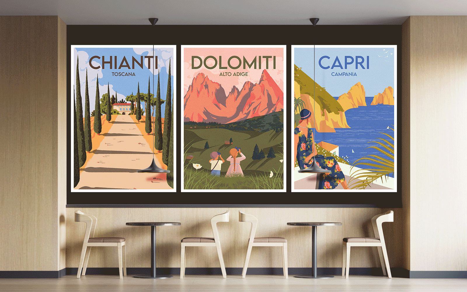 Il locale viene poi caratterizzato da poster turistici illustrati dal mood vintage che celebrano le città d’Italia, con l’obiettivo di evocare il piacere del viaggio e la varietà delle ricette. I videowall sono un efficace strumento di comunicazione dell’innovativa offerta ristorativa ed evidenziano il racconto della genuinità di prodotti preparati al momento.