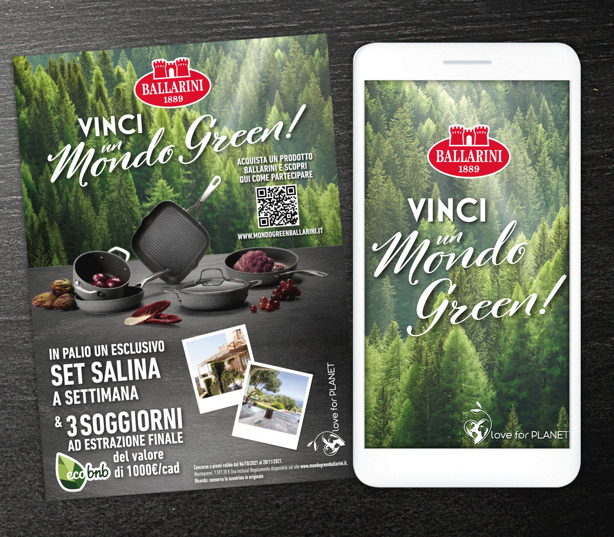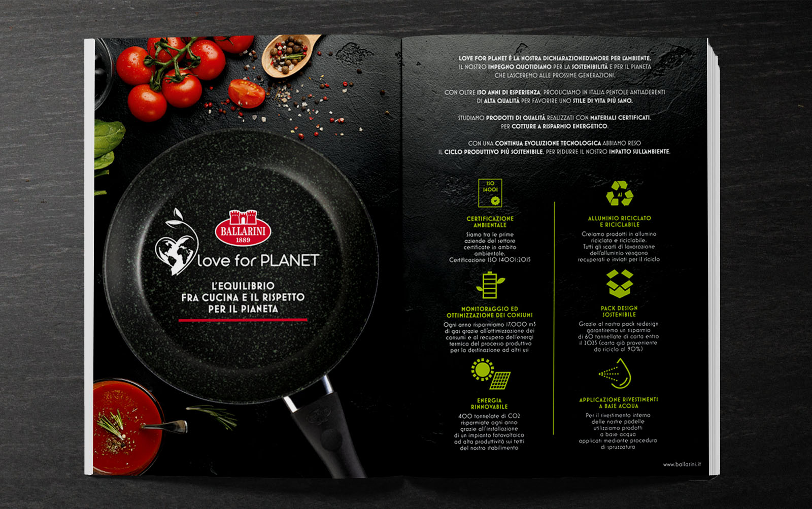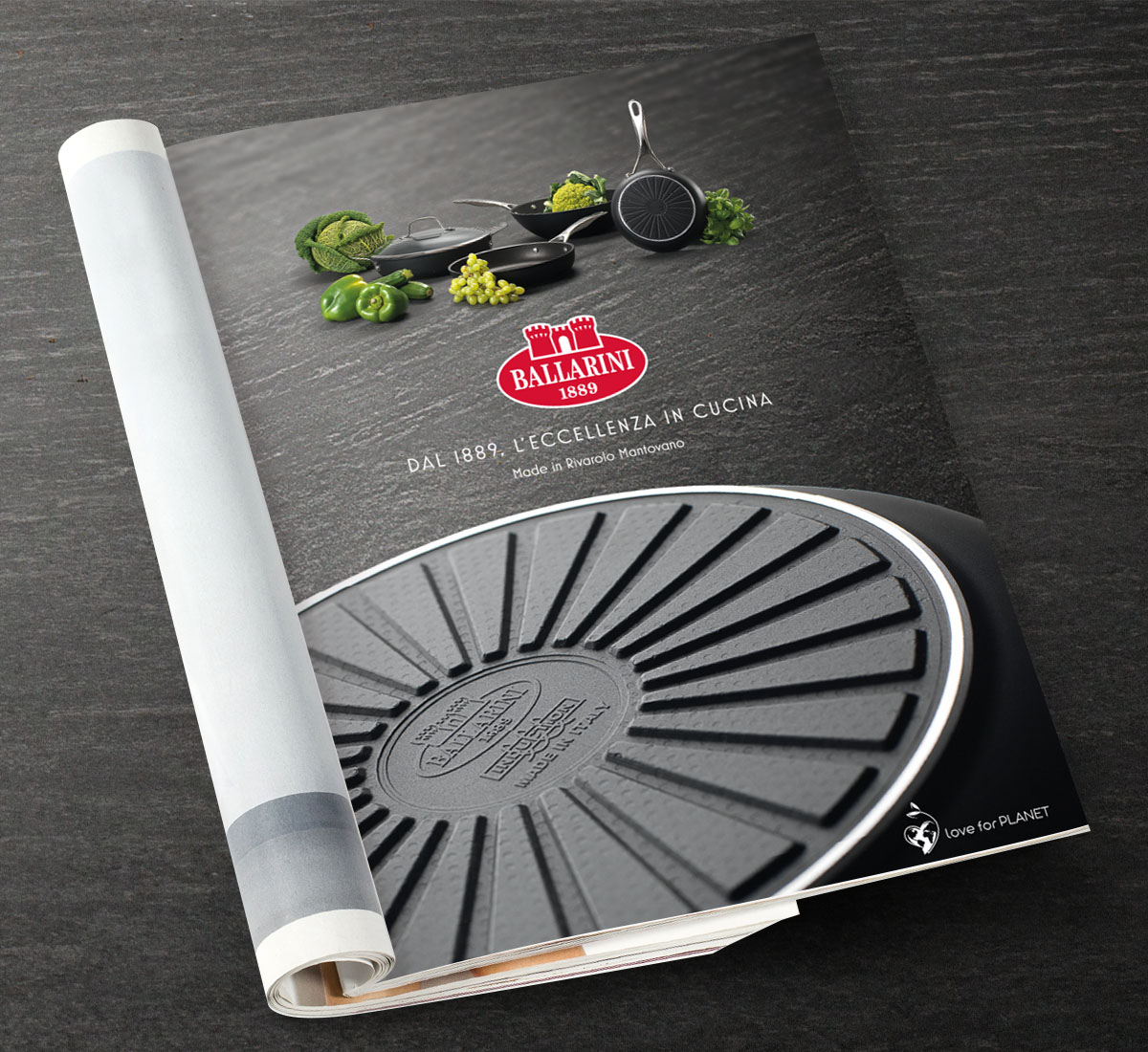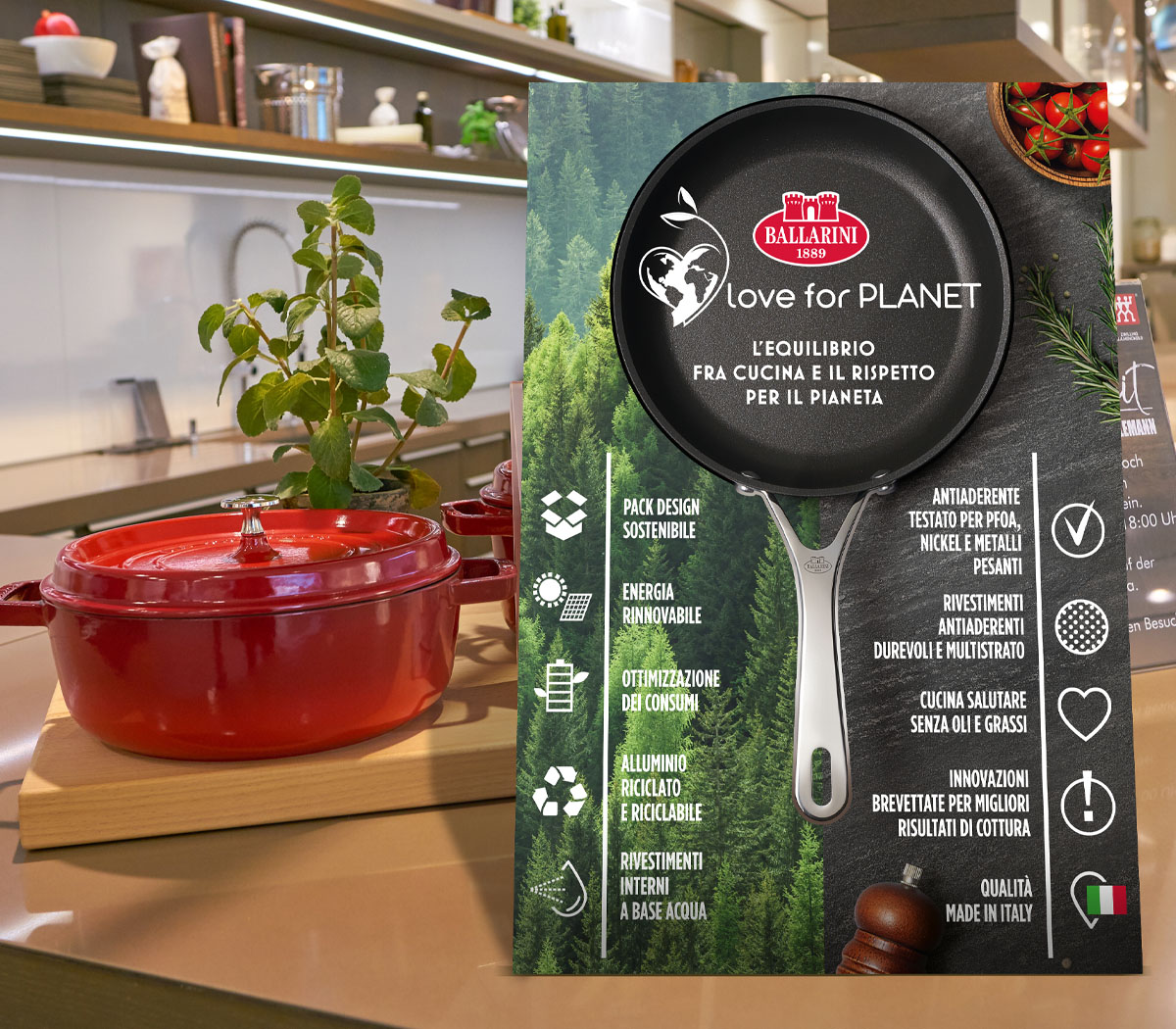 Per il canale consumer abbiamo progettato un sistema di comunicazione fondato su ambientazioni fotografiche, studiate ad hoc, con un forte richiamo cromatico, che promuove la piattaforma ‘Love For Planet’ per esprimere i valori di sostenibilità su cui Ballarini sta investendo da molto tempo.
