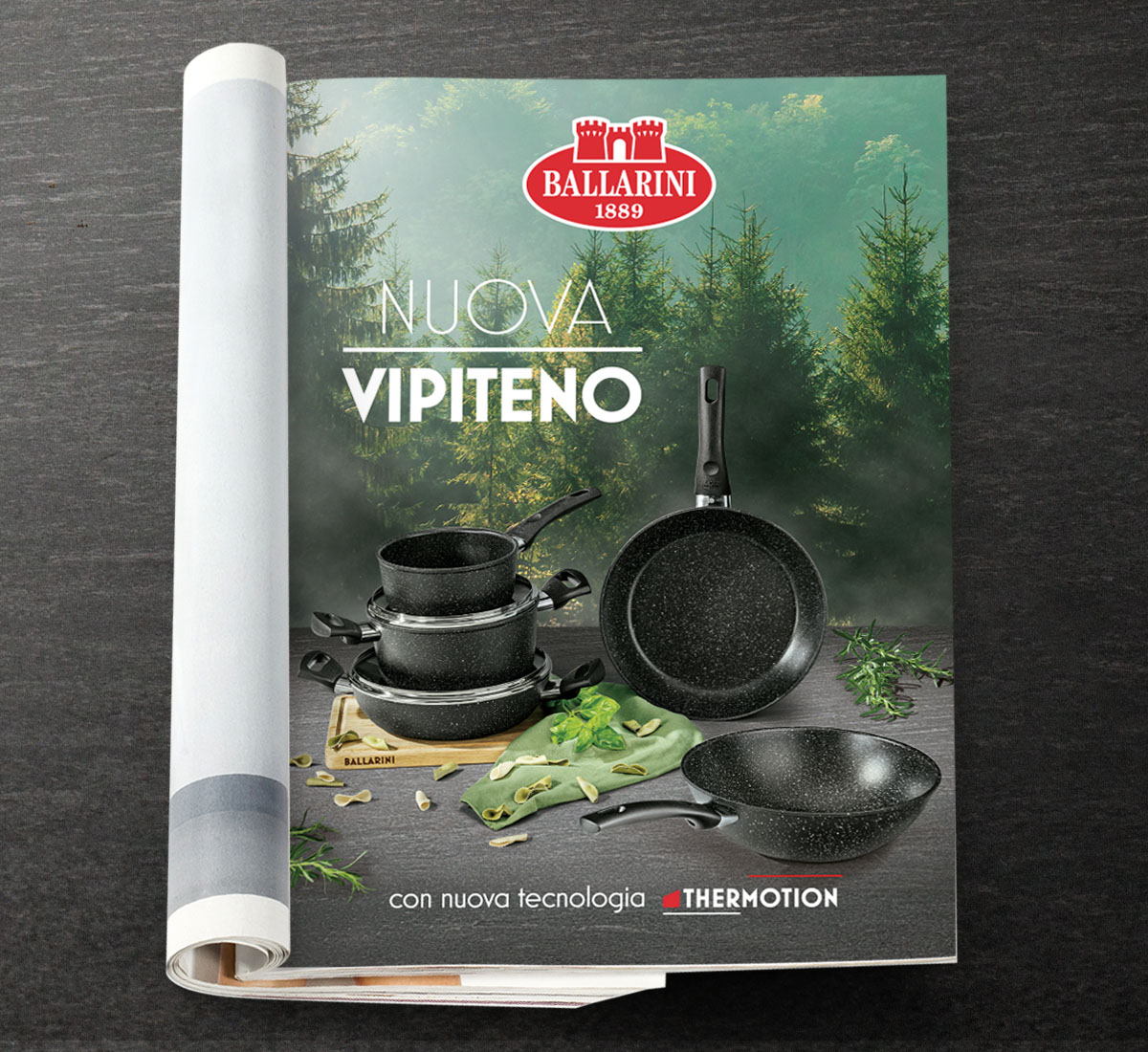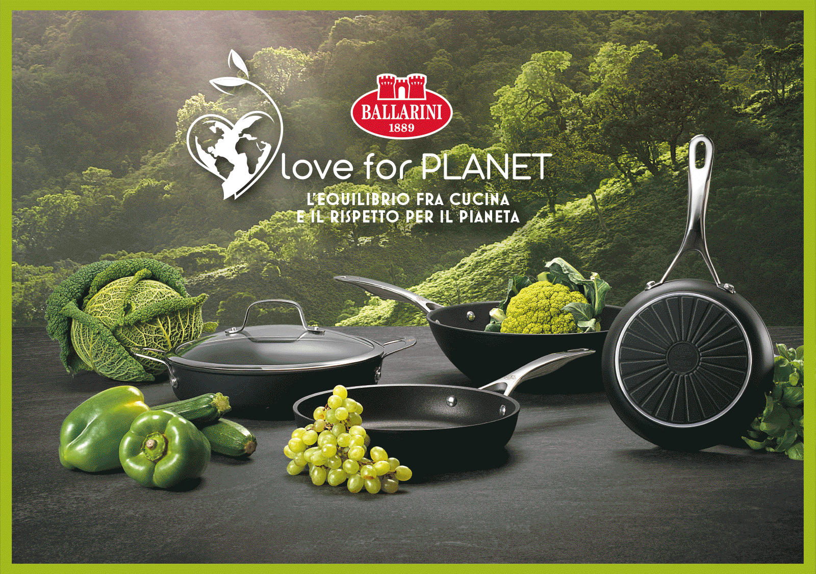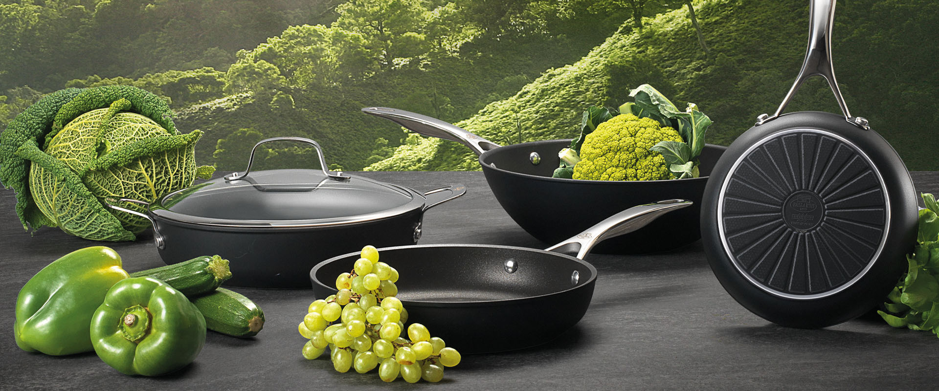 Gli scatti di linea, con una selezione di pentole e padelle, sono stati ambientati non in una comune cucina ma su un piano con sfondi fotografici naturali per evocare il rispetto per l’ambiente.