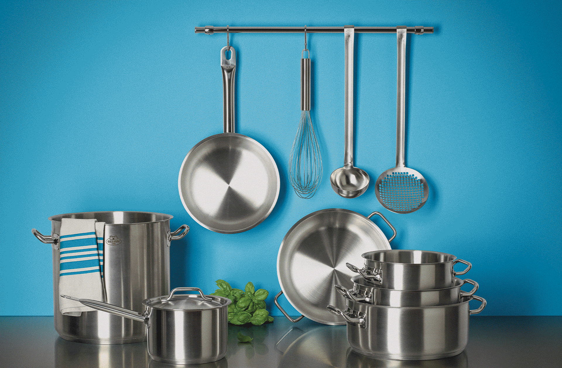Scatti still life con sfondi che richiamano i colori dei packaging completano la comunicazione per Ballarini Professionale.