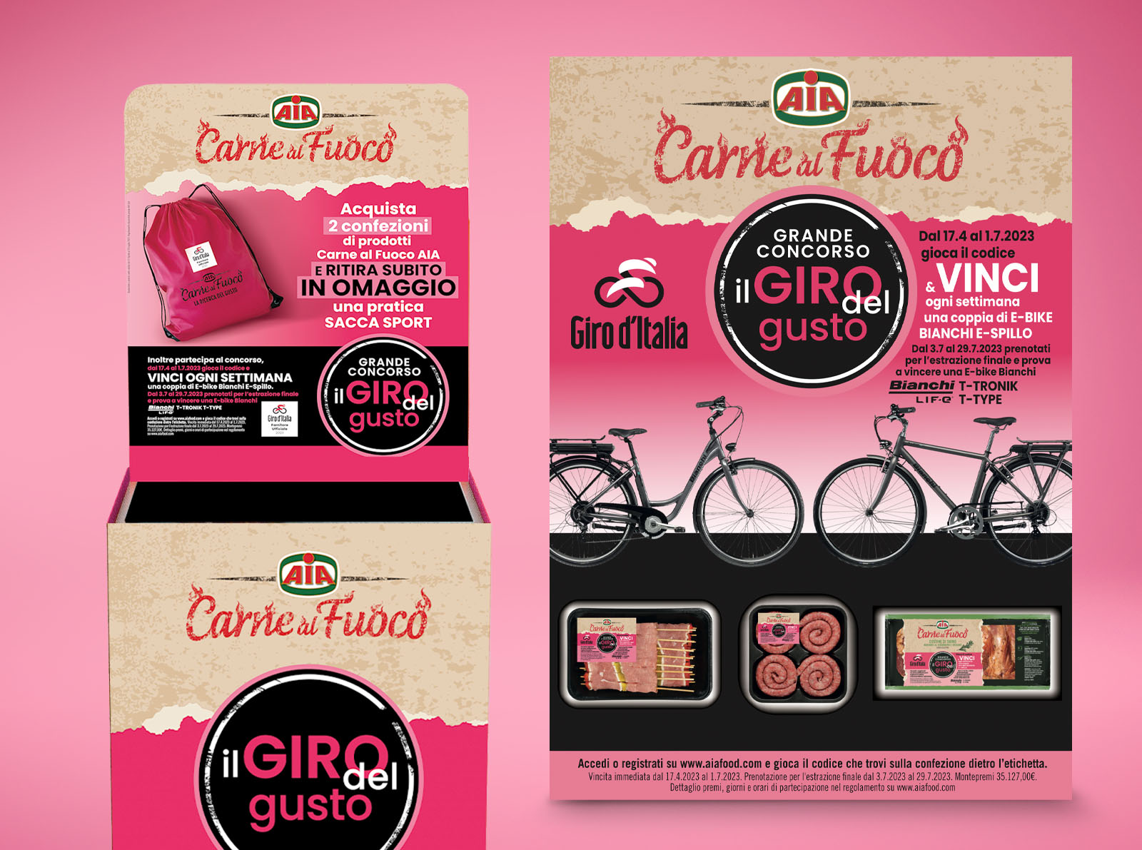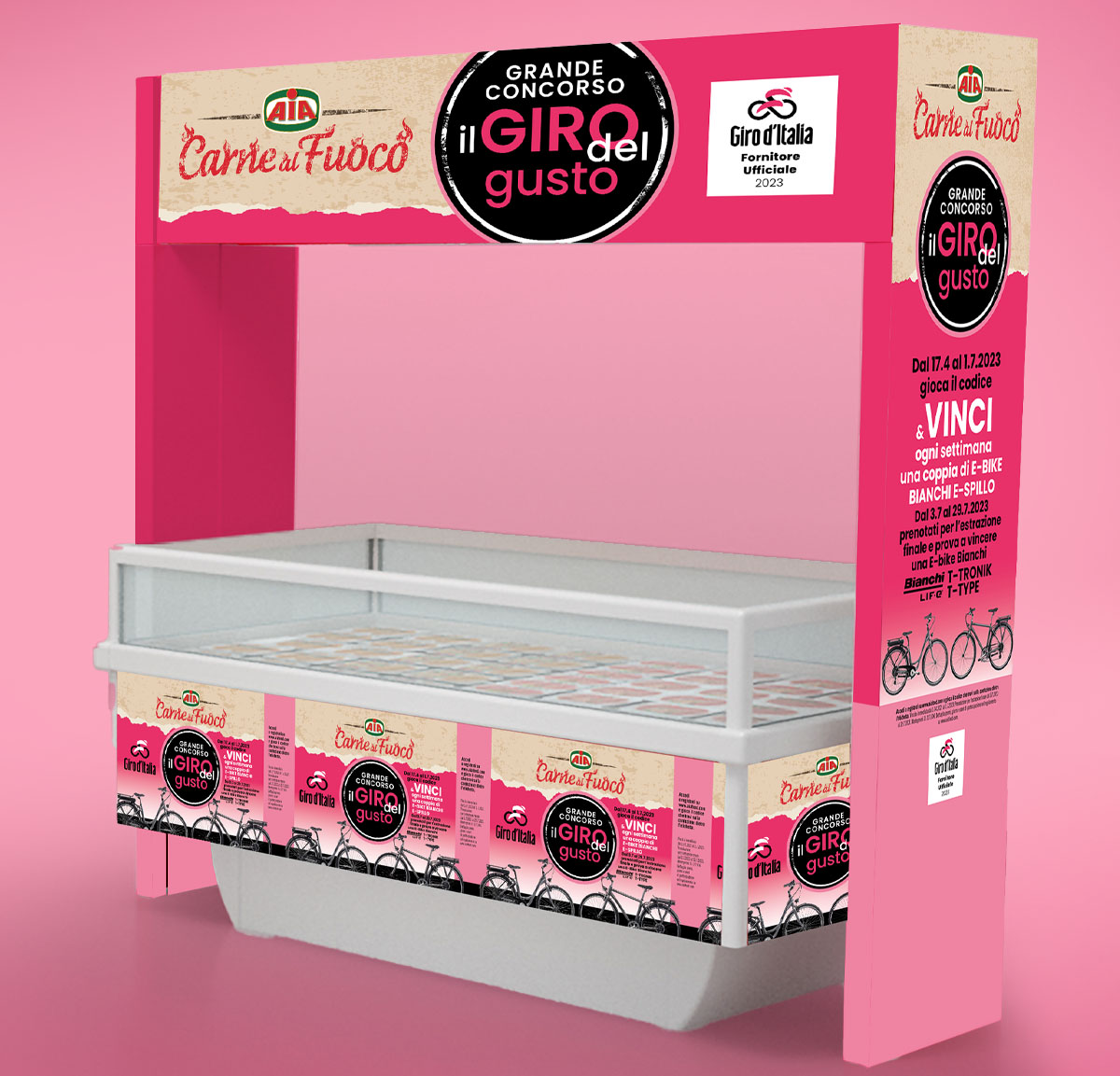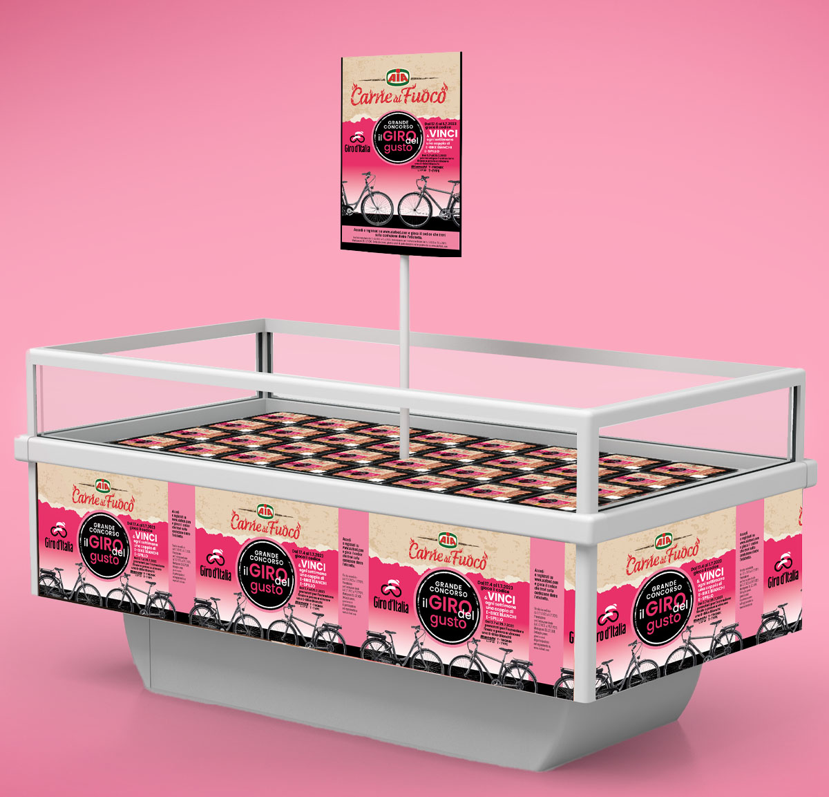 Il Giro d’Italia targato Aia invade il punto vendita con un messaggio immediato e un effetto cromatico deciso: il progetto ha previsto la creazione di packaging promozionali ma anche di materiali a supporto, come locandine, espositori, vasche e piantane.