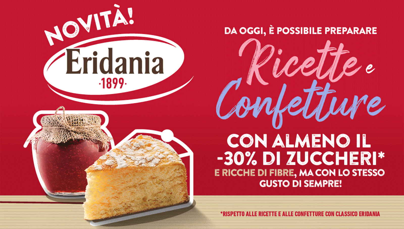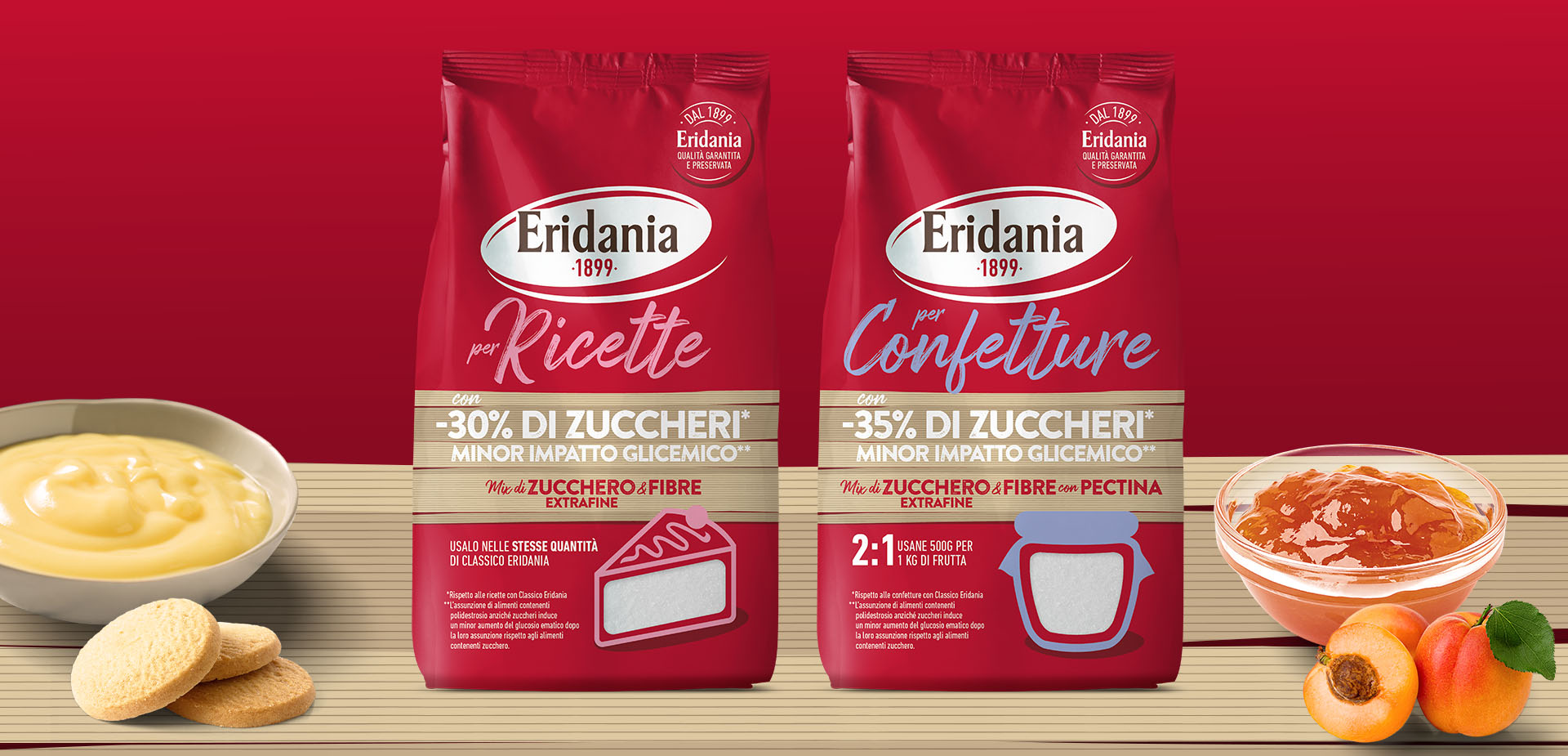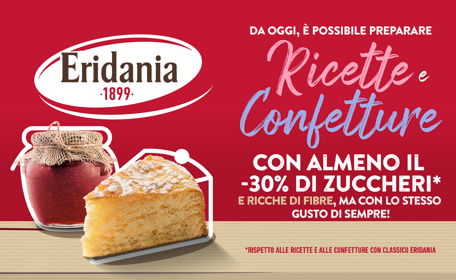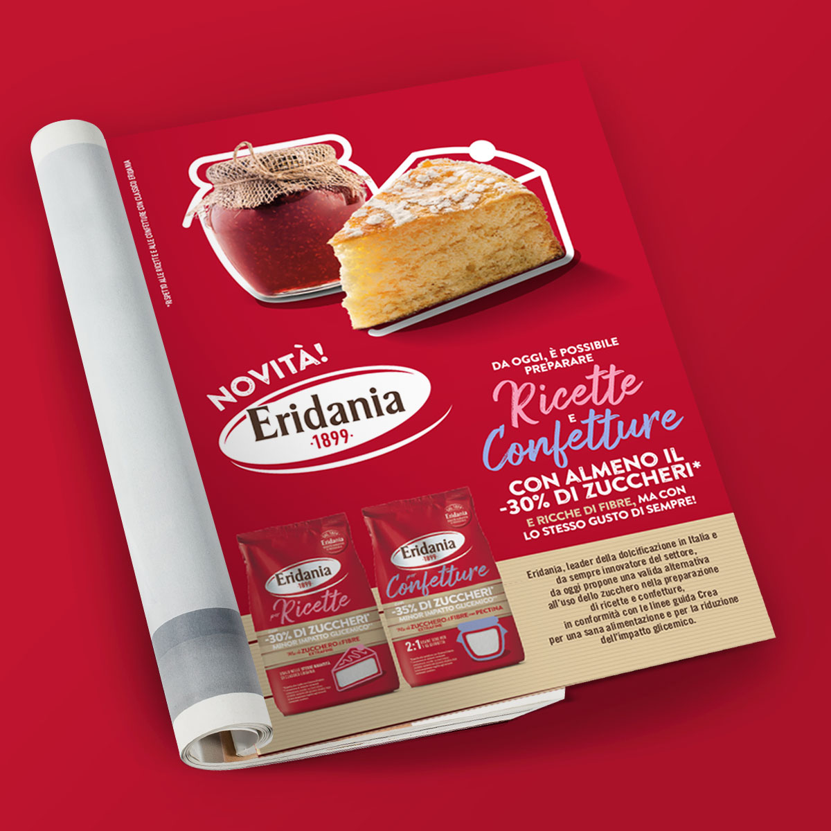 Da qui la scelta di un’immagine che assumesse il color code dello zucchero Classico di Eridania ma che allo stesso tempo comunicasse con immediatezza la novità e i plus del prodotto. Il rosso Eridania è stato infatti arricchito della presenza di una banda materica che veicolasse la presenza all’interno della ricetta di una parte di fibre.