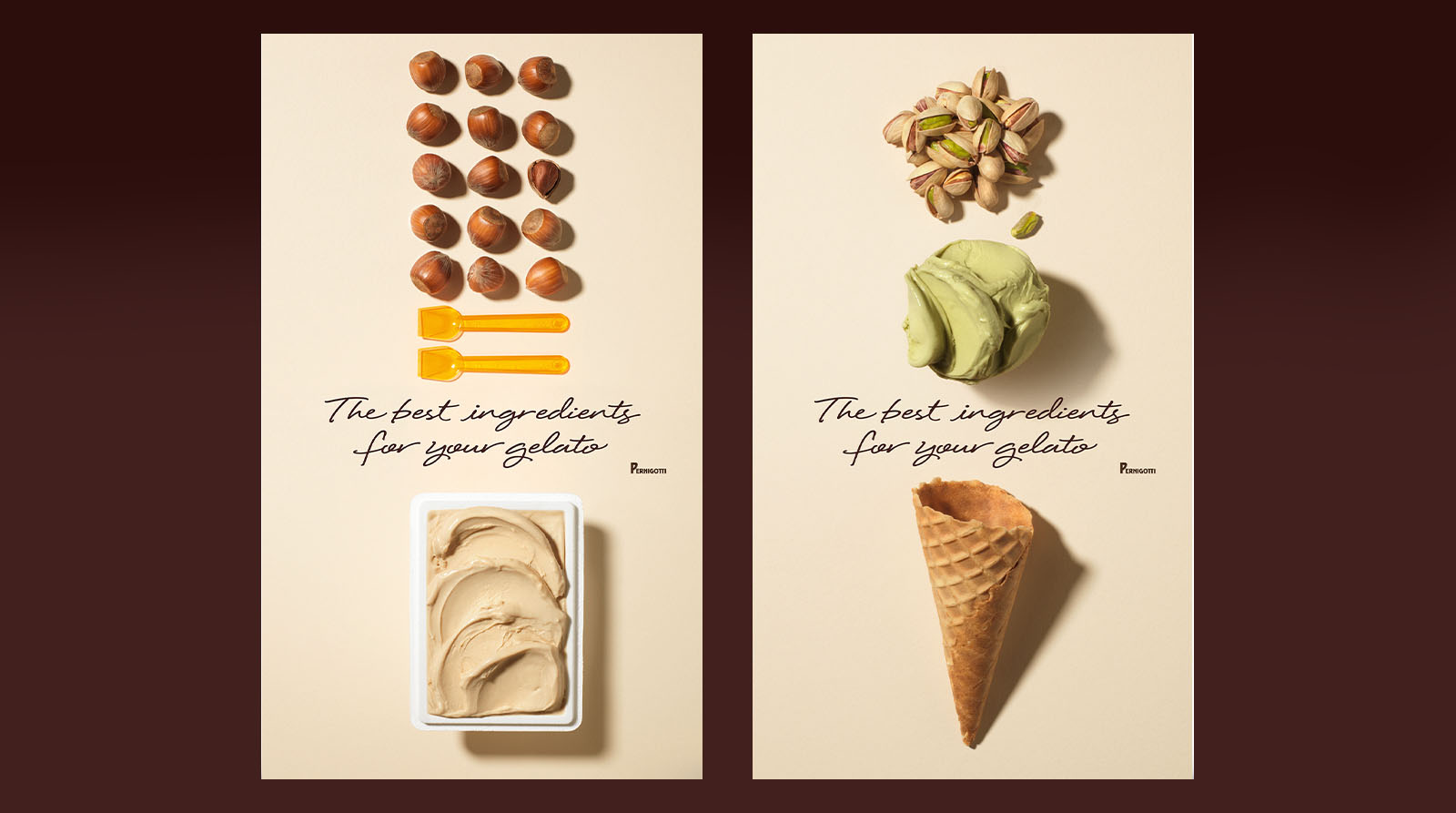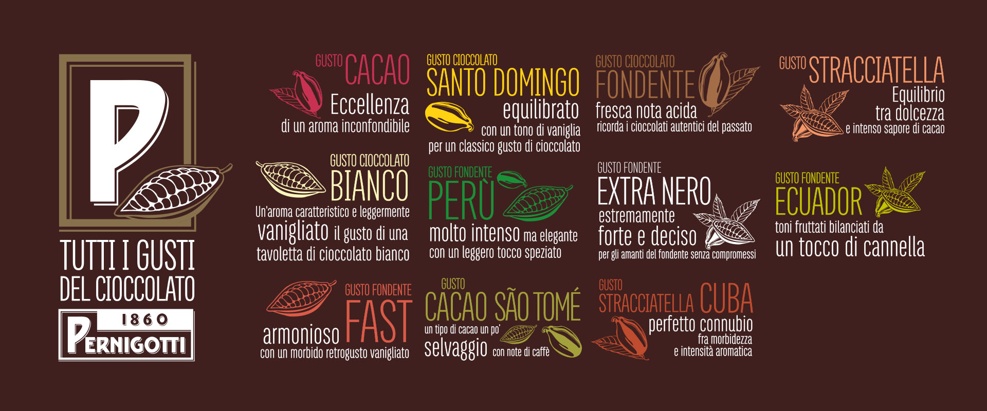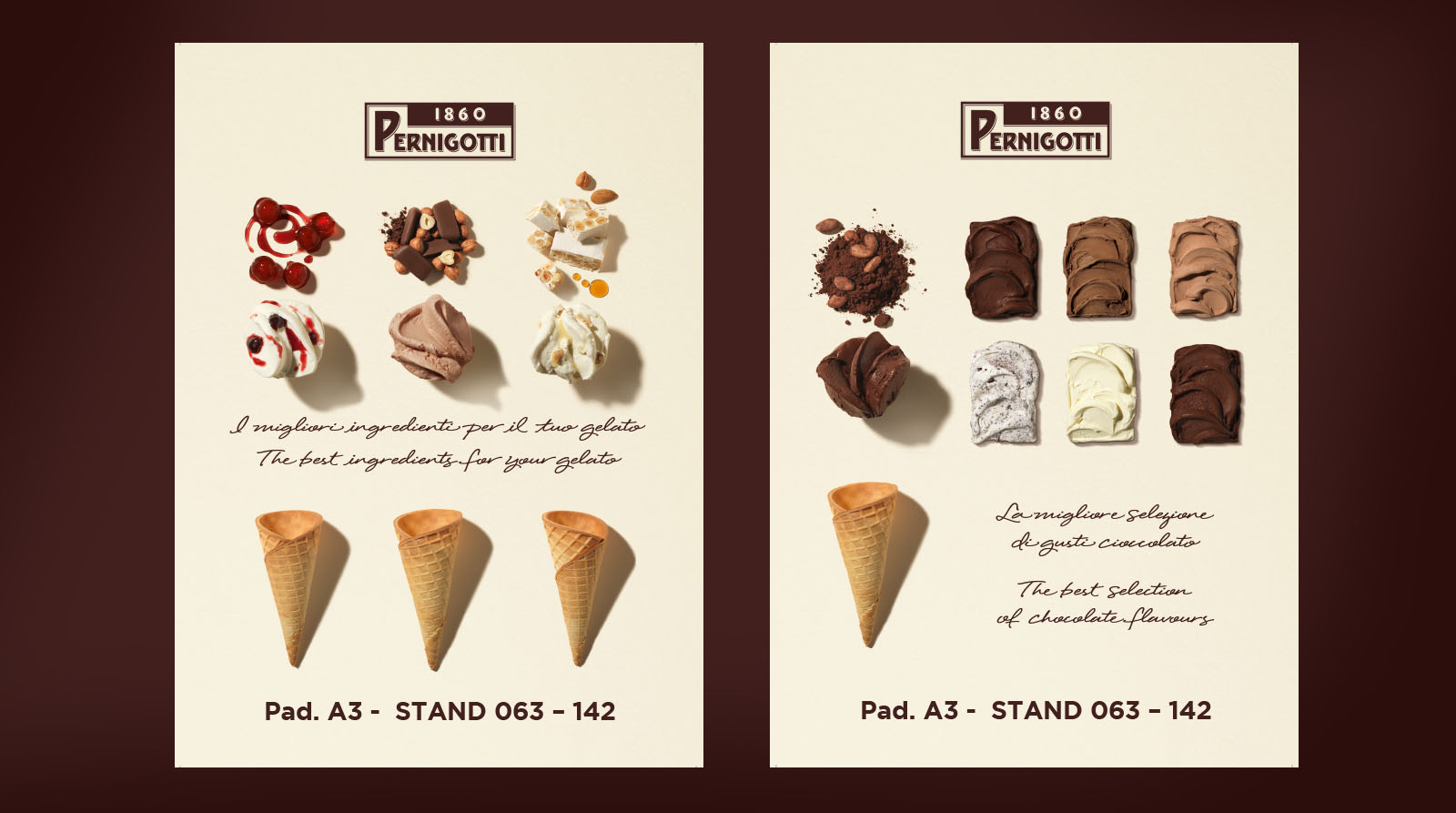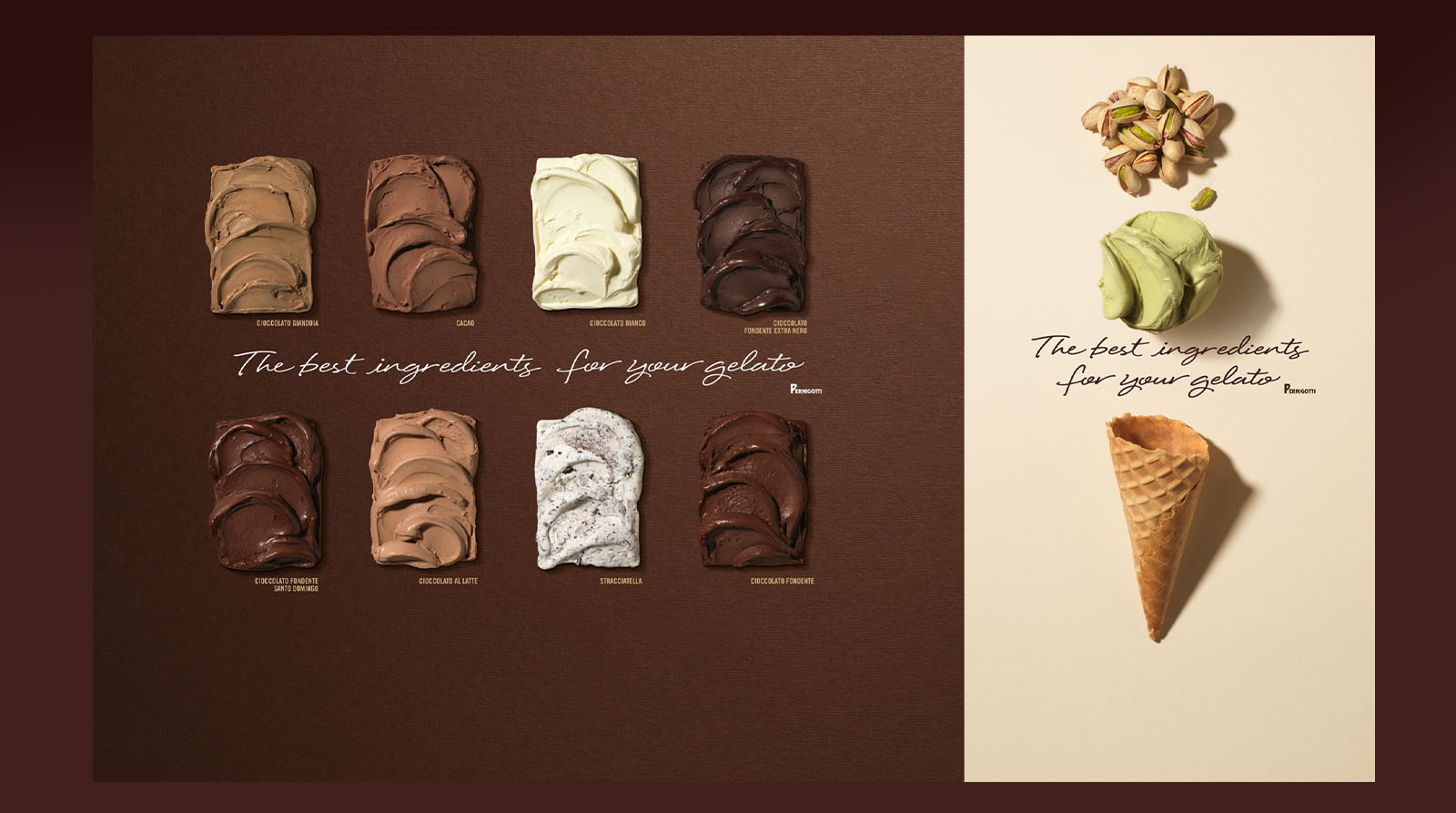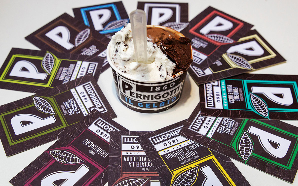 In occasione del Sigep 2016, Pernigotti ci ha chiesto di progettare una nuova immagine coordinata in grado di veicolare la qualità del suo gelato e delle materie prime, in particolare dei gusti cremosi, con un focus speciale sulla grande varietà di cioccolati.