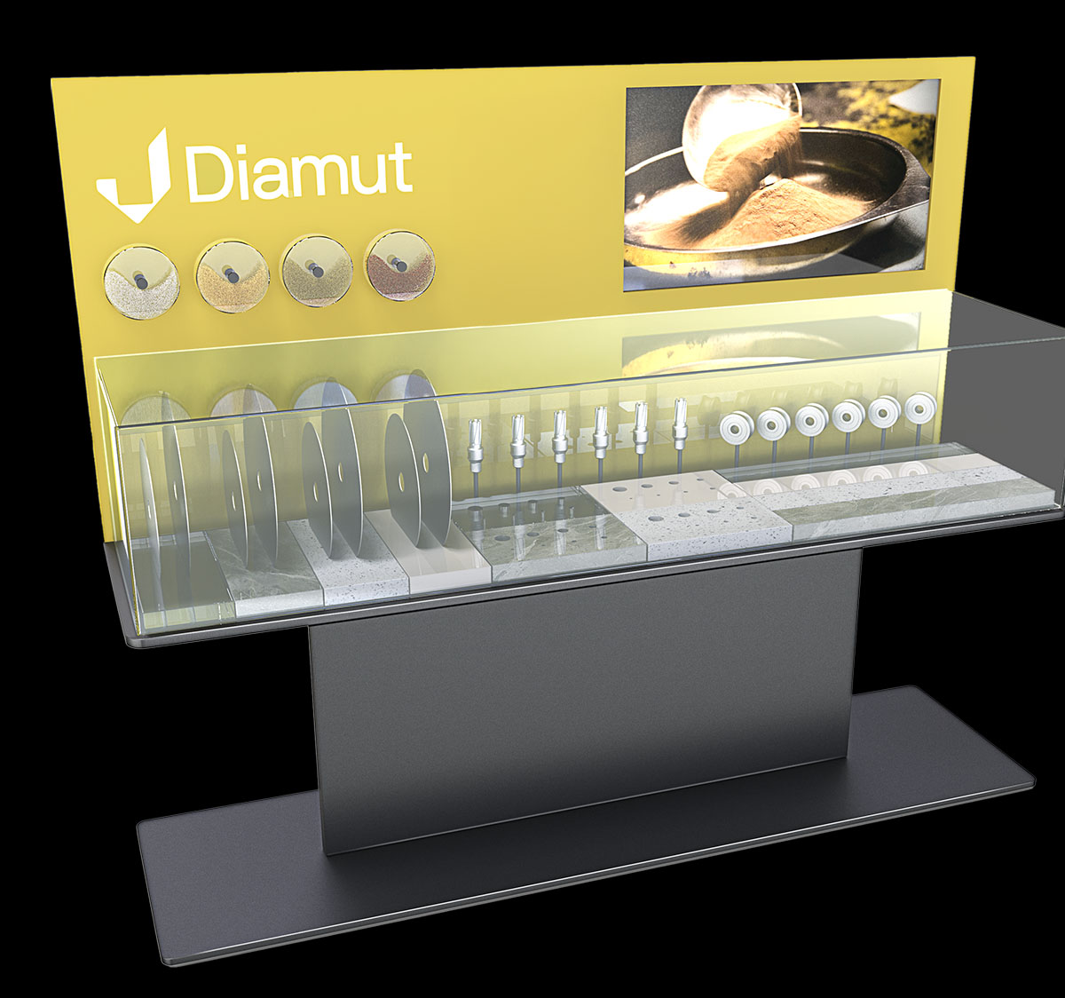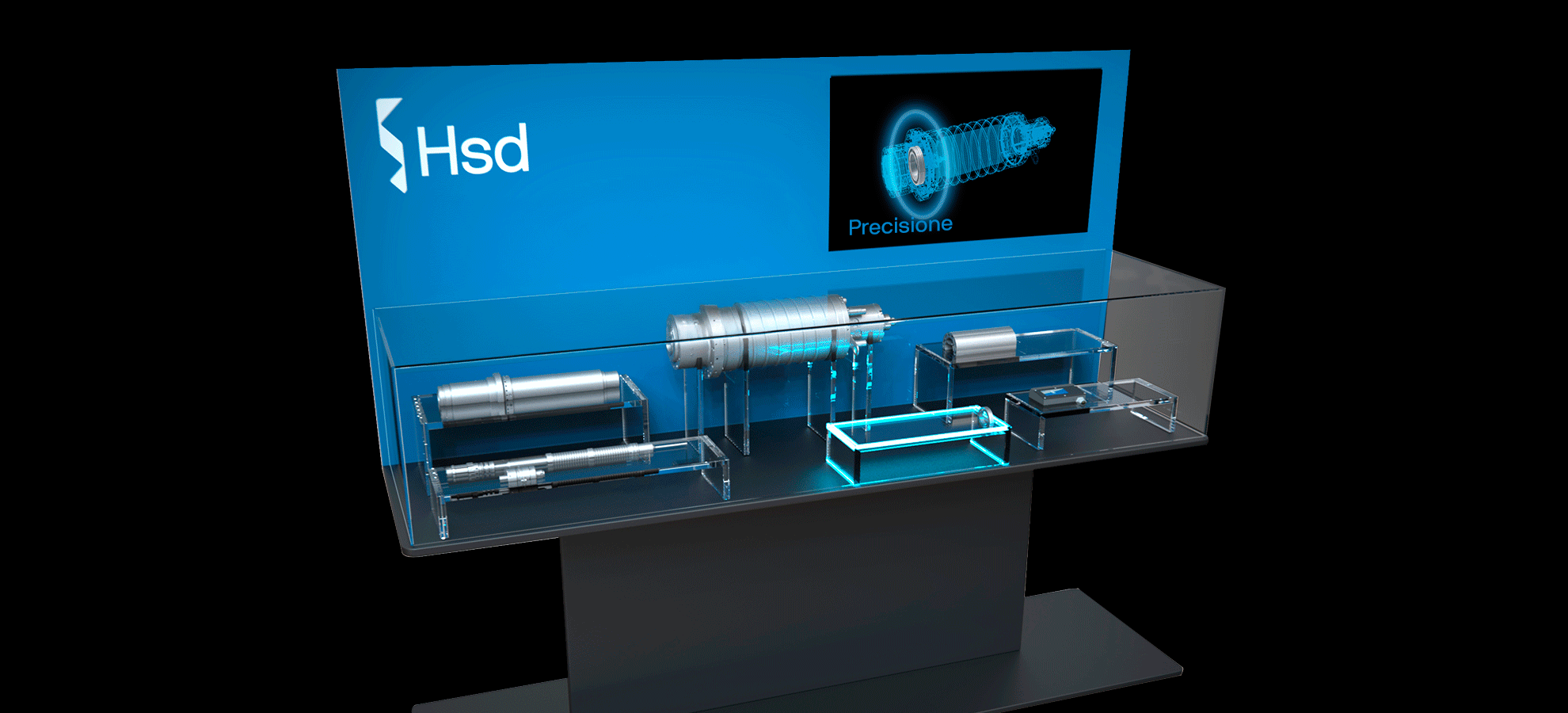 Le teche ospitavano due video dedicati: nel caso di Diamut il racconto della magia delle polvere, tra cui quella di diamante, la cui sapiente miscela è alla base dell’alta performance dei suoi tools; per quanto riguarda Hsd, la scelta è stata quella di esaltare la componente meccanica ed elettronica dell’elettromandrino “eroe”, e usare le sue caratteristiche come base del racconto del brand.