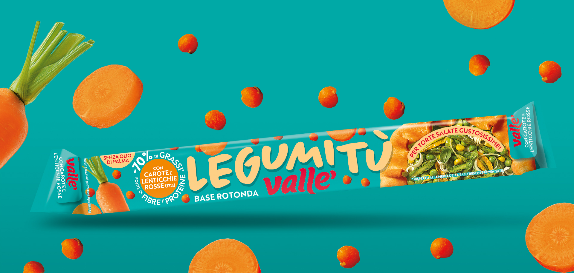 Abbiamo disegnato questo nuovo packaging creando innanzitutto un naming esplicativo che fosse in grado di raccontare l’innovazione della ricetta, e che fosse allo stesso tempo in linea con Passpartù, il nuovo sub-brand della linea sfoglie di Vallè. Nasce così Legumitù, un nome che, giocando con l’accento e gli ingredienti riesce a raccontare con semplicità e innovazione le caratteristiche del prodotto.